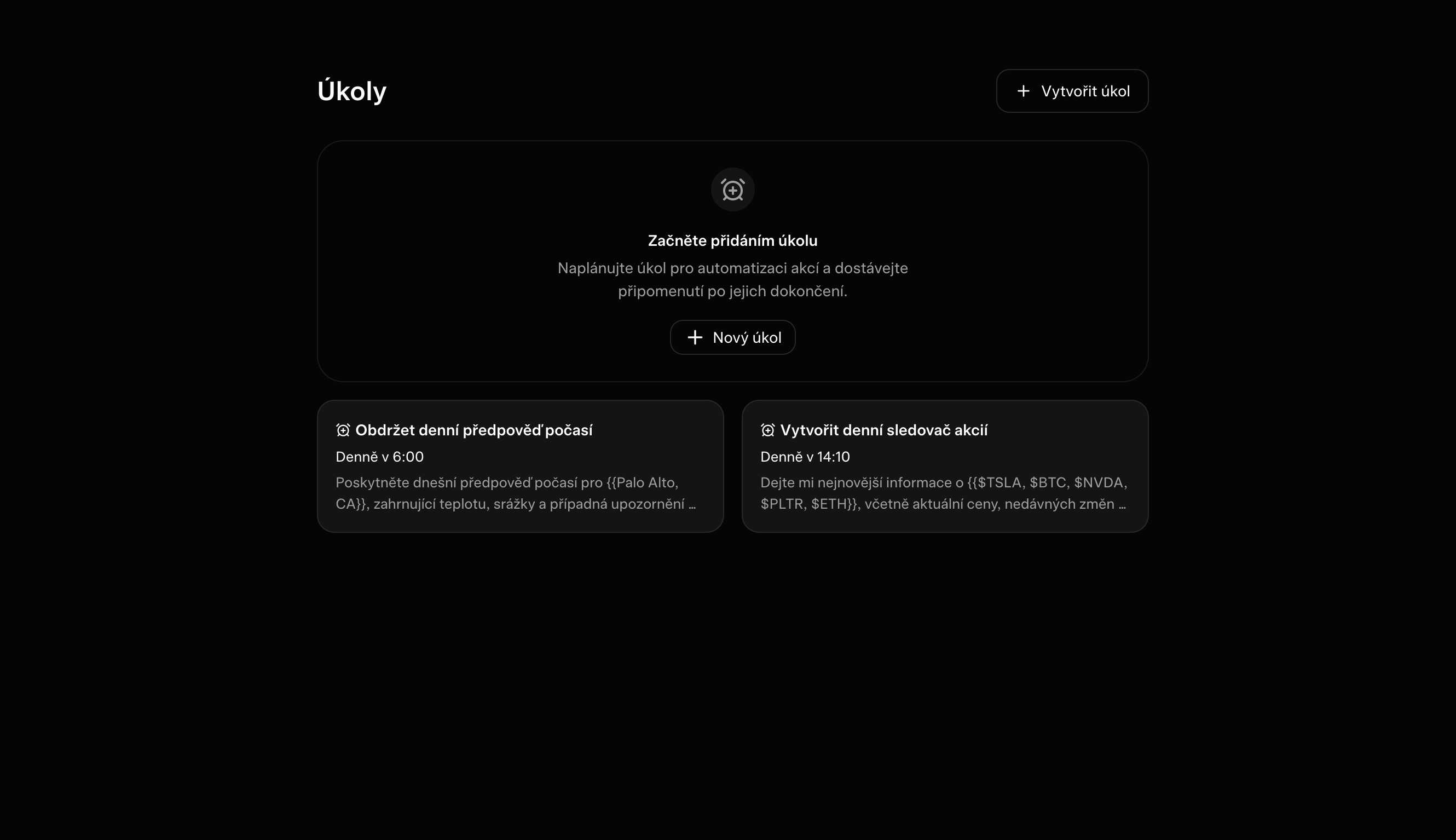 Klikni na "Create Task". Vyber frekvenci (daily, weekly, monthly nebo yearly) a napiš prompt. Pár nápadů: